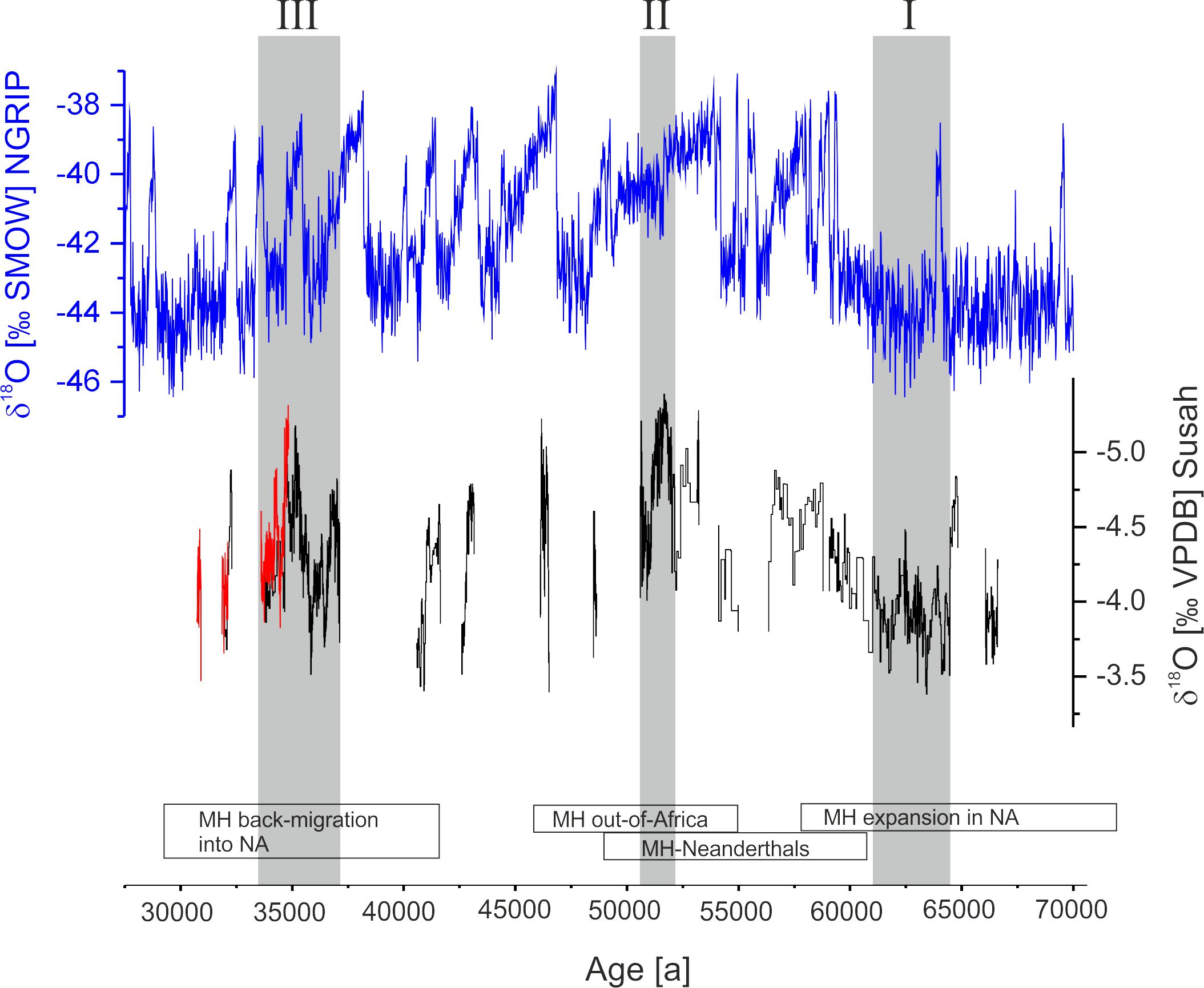 Libya (Hoffmann et al., 2016). The red lines show position of red layers in the stalagmites which indicate red dust deposition.